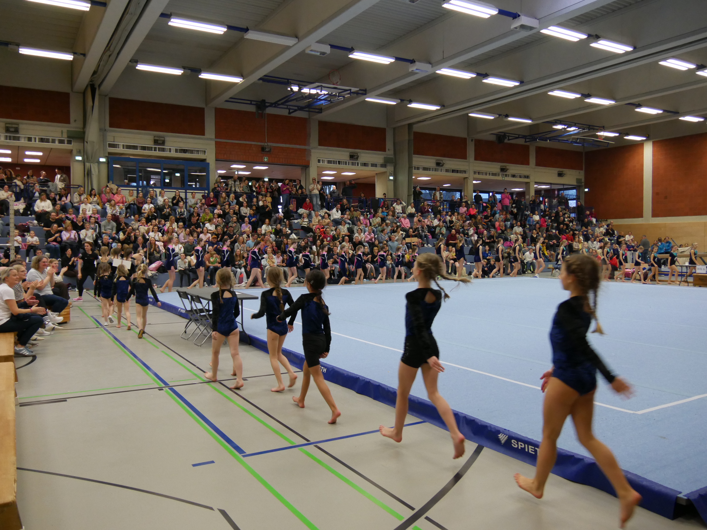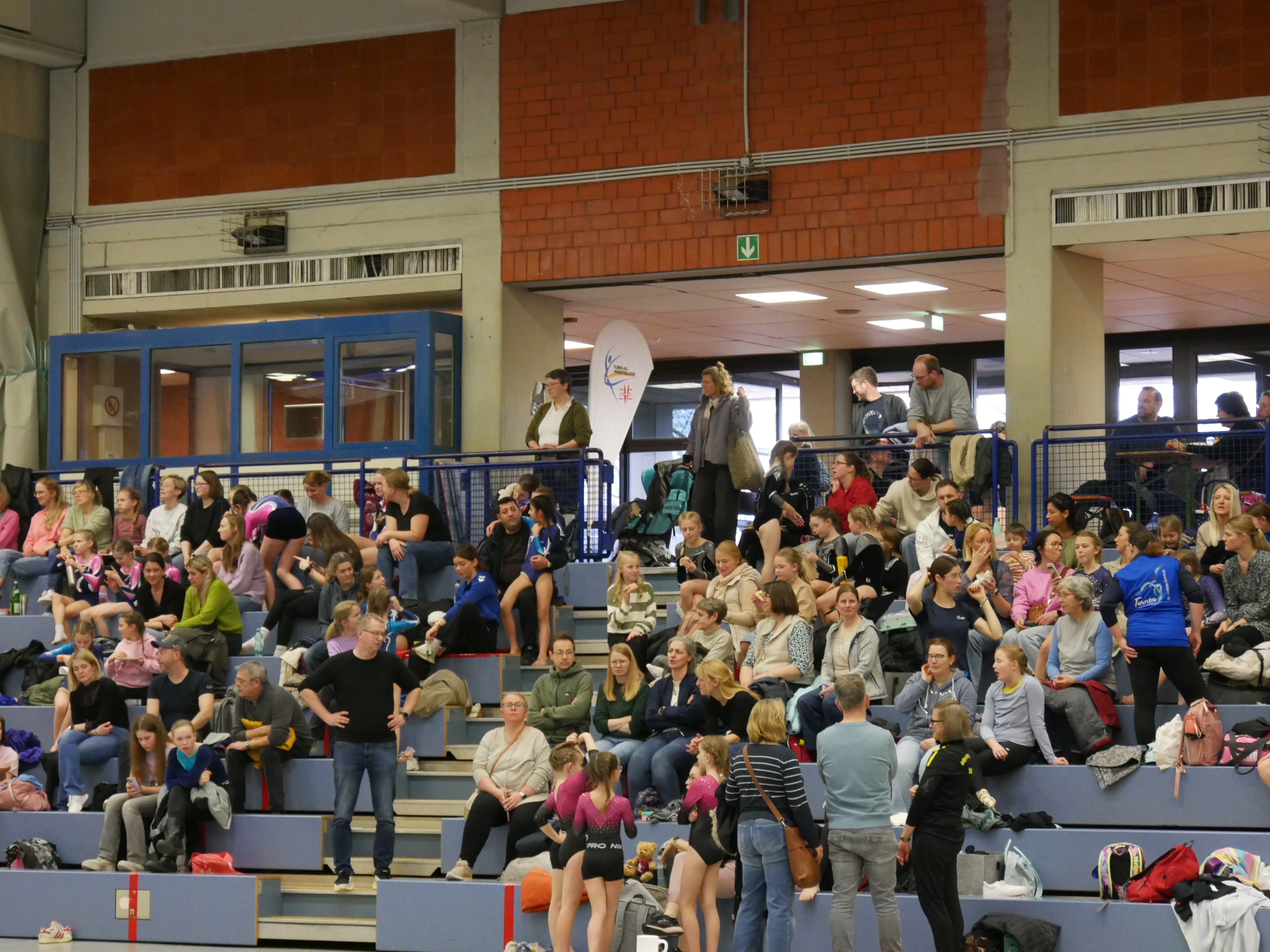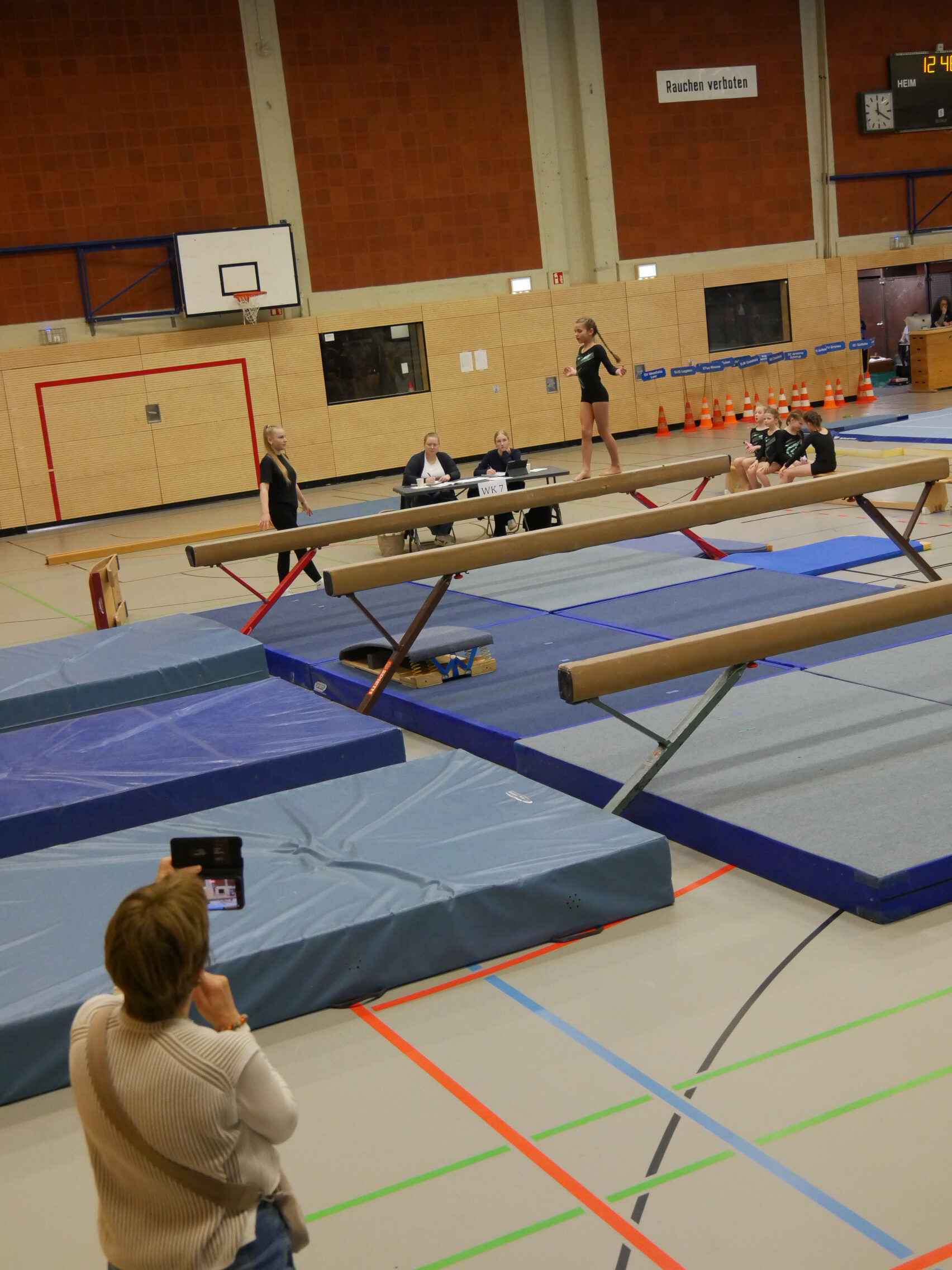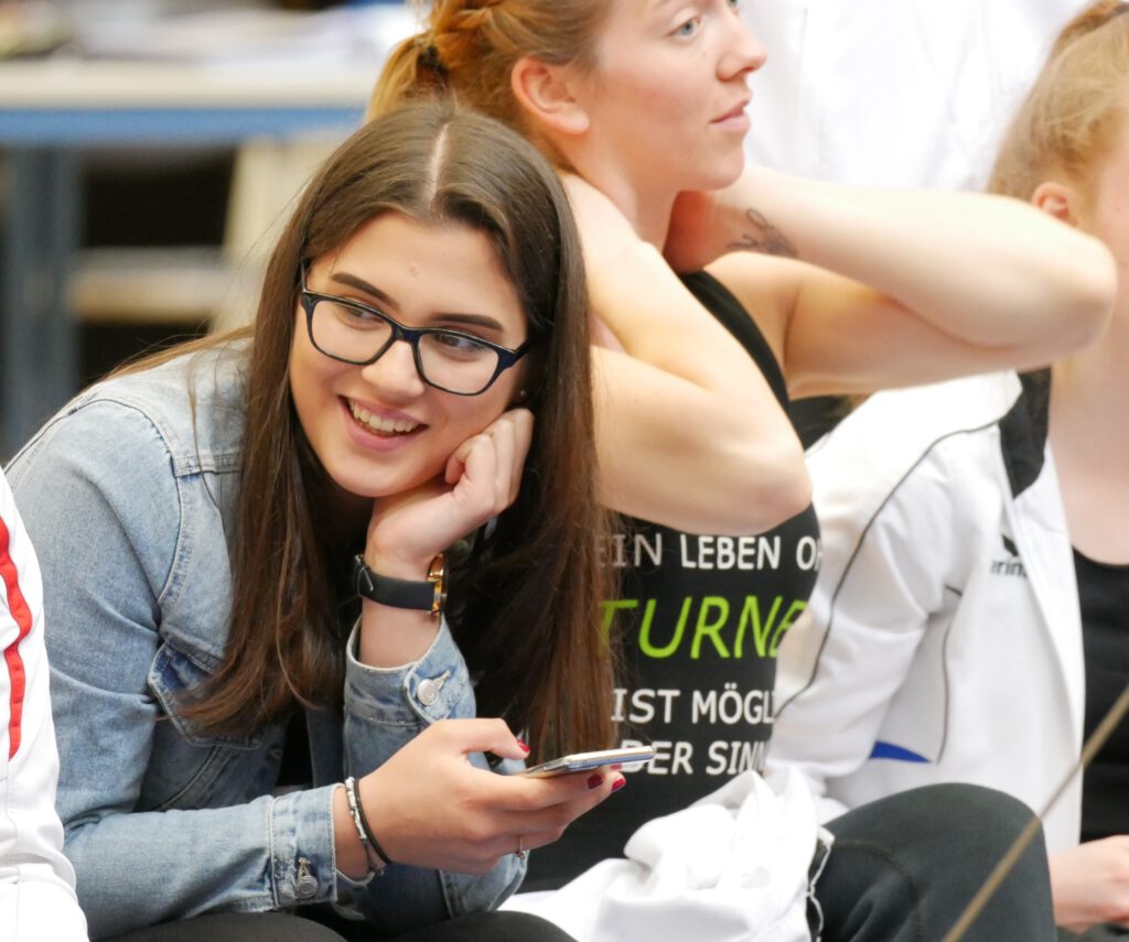 In der Halle, auf den Turnfläche und auf den Rängen kein freier Fleck. Im Schulzentrum von Coesfeld waren mehr als 200 junge Turnerinnen aus dem gesamten 2. Bezirk zum Wettkampf in zwei Durchgängen gekommen. Der Ausrichter DJK Eintracht Coesfeld hatte am Tag zuvor die Halle mit vielen helfenden Händen vorbereitet. Für den reibungslosen Ablauf sind viele engagierte Personen im Einsatz. Fahrzeiten von 2 Stunden konnten nicht abschrecken. Familienmitglieder fotografierten und filmten fleißig. Die Übung war just beendet, war der Mitschnitt mit der Familie geteilt. Zur späteren Analyse und Freude über die gezeigte Leistung sind diese Aufzeichnungen sinnvoll.