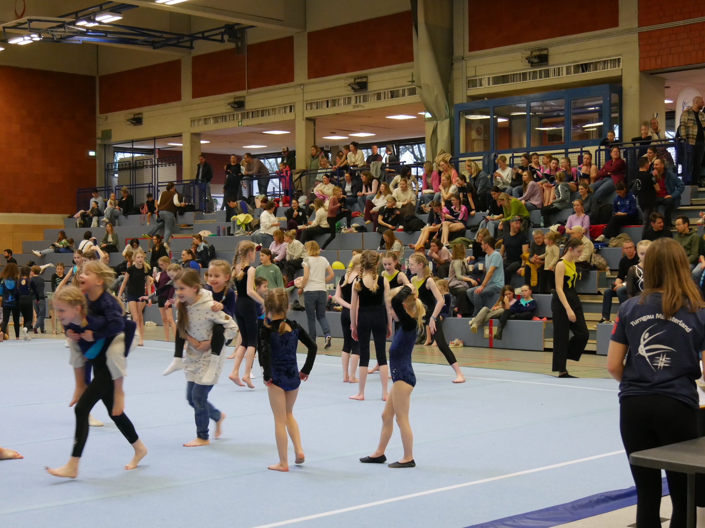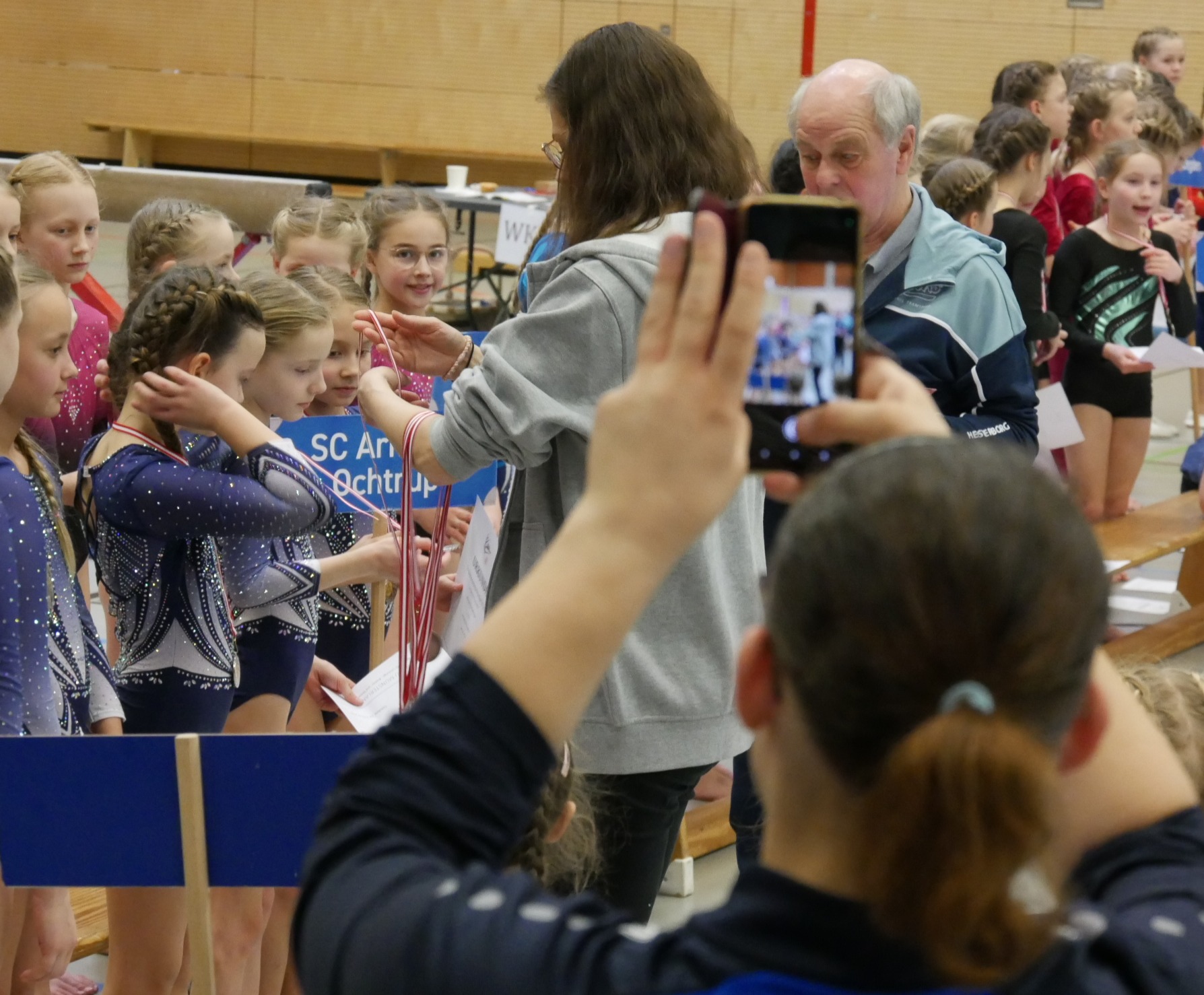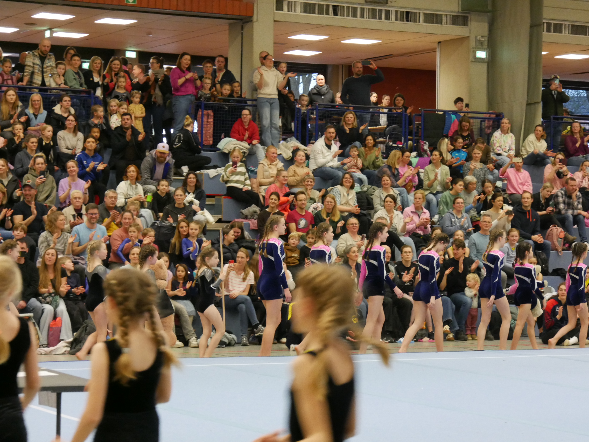In der Halle, auf den Turnfläche und auf den Rängen kein freier Fleck. Im Schulzentrum von Coesfeld waren mehr als 200 junge Turnerinnen aus dem gesamten 2. Bezirk zum Wettkampf in zwei Durchgängen gekommen. Der Ausrichter DJK Eintracht Coesfeld hatte am Tag zuvor die Halle mit vielen helfenden Händen vorbereitet. Für den reibungslosen Ablauf sind viele engagierte Personen im Einsatz. Fahrzeiten von 2 Stunden konnten nicht abschrecken. Familienmitglieder fotografierten und filmten fleißig. Die Übung war just beendet, war der Mitschnitt mit der Familie geteilt. Zur späteren Analyse und Freude über die gezeigte Leistung sind diese Aufzeichnungen sinnvoll.