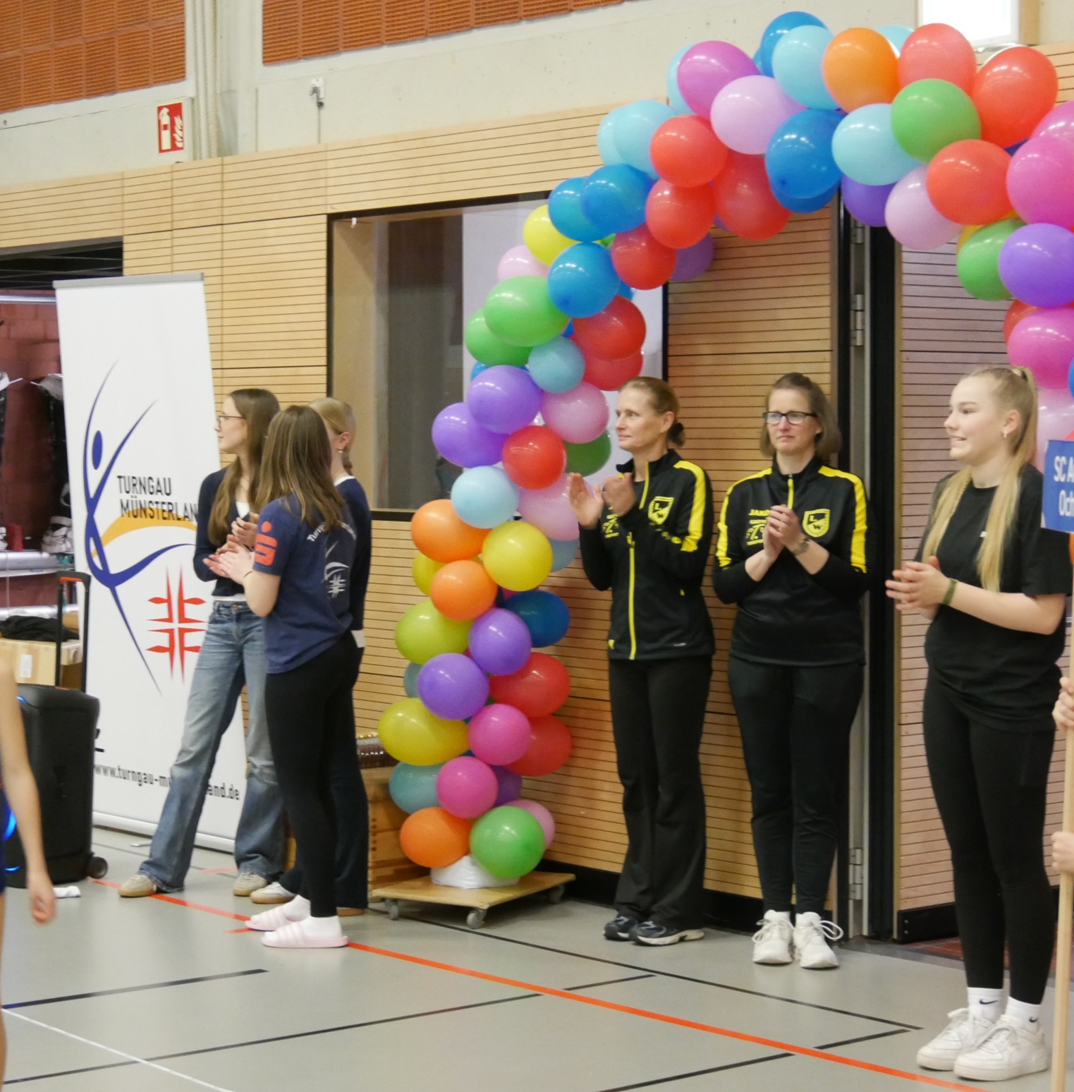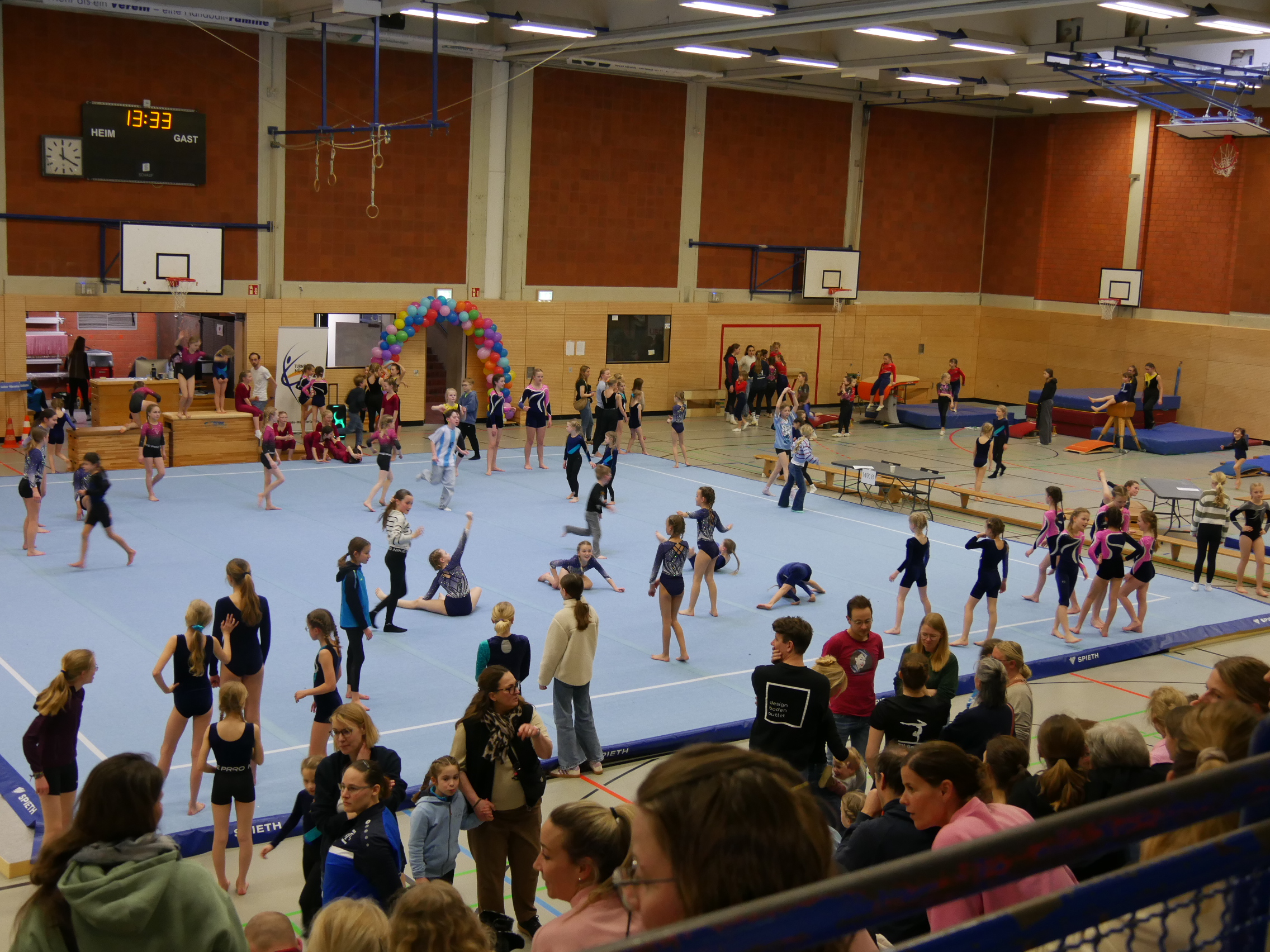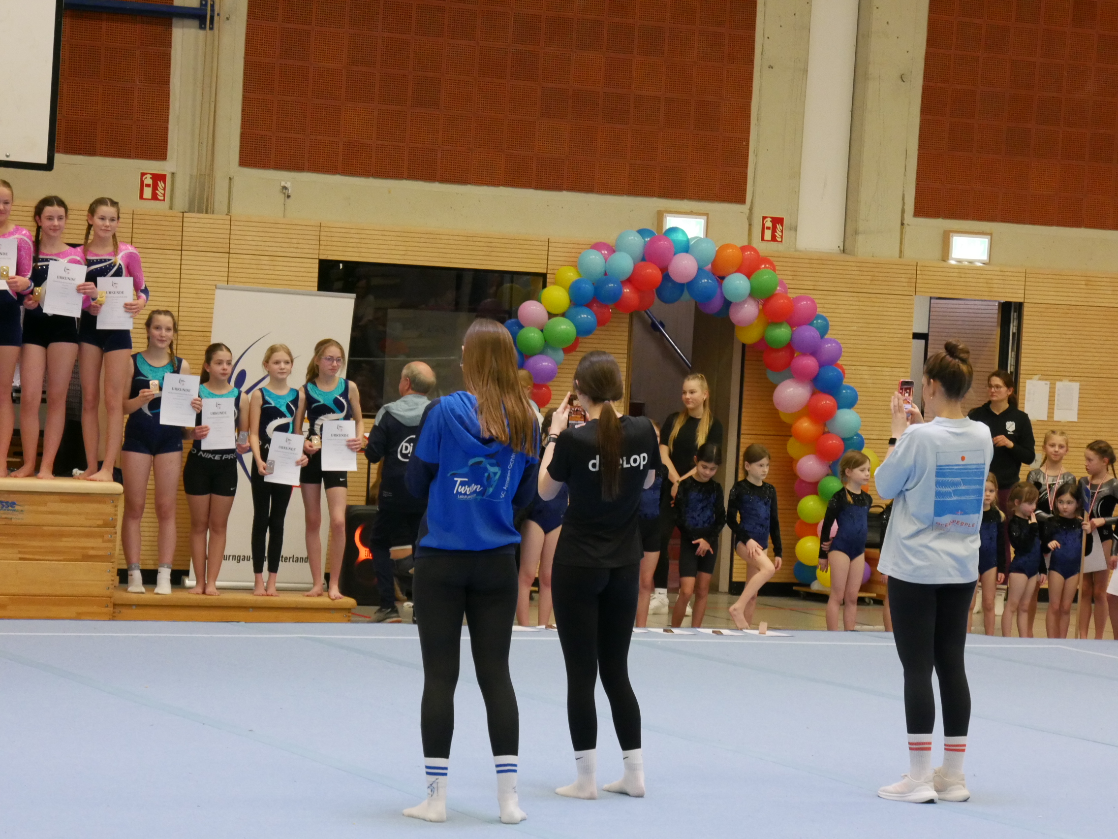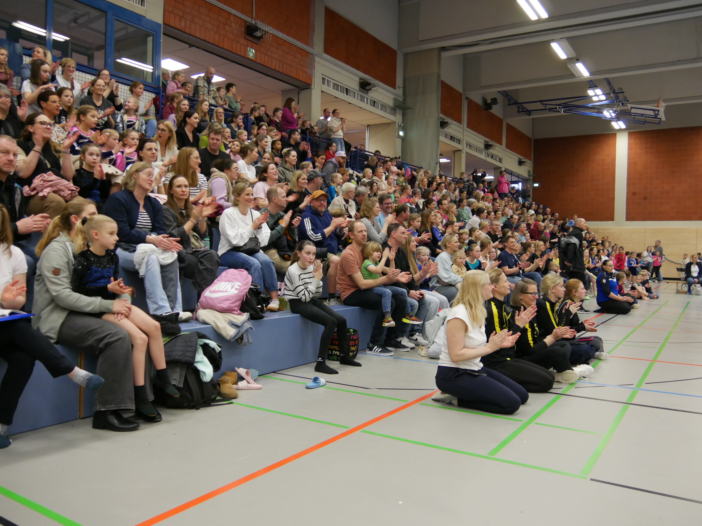 In der Halle, auf den Turnfläche und auf den Rängen kein freier Fleck. Im Schulzentrum von Coesfeld waren mehr als 200 junge Turnerinnen aus dem gesamten 2. Bezirk zum Wettkampf in zwei Durchgängen gekommen. Der Ausrichter DJK Eintracht Coesfeld hatte am Tag zuvor die Halle mit vielen helfenden Händen vorbereitet. Für den reibungslosen Ablauf sind viele engagierte Personen im Einsatz. Fahrzeiten von 2 Stunden konnten nicht abschrecken. Familienmitglieder fotografierten und filmten fleißig. Die Übung war just beendet, war der Mitschnitt mit der Familie geteilt. Zur späteren Analyse und Freude über die gezeigte Leistung sind diese Aufzeichnungen sinnvoll.